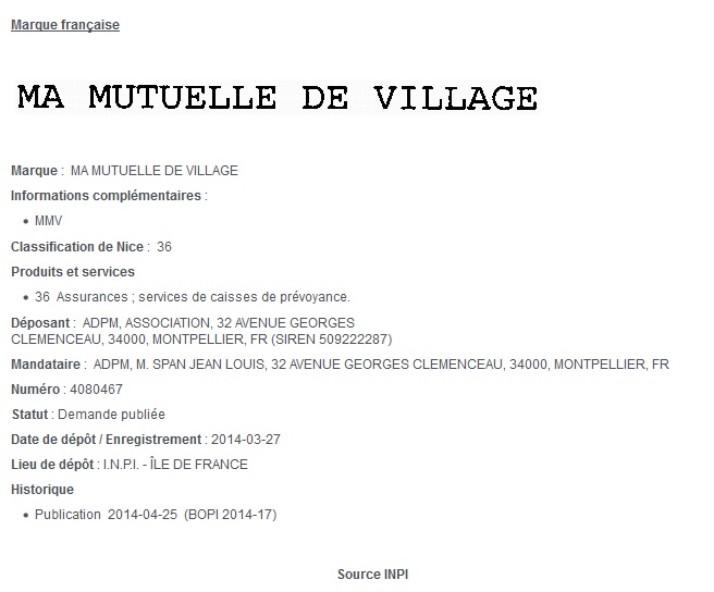 Ma Mutuelle de Village est une marque déposée L'ADPM a déposé son dossier de mutuelle de village à l'Inpi, selon une charte qui fait des valeurs mutualistes et d'entraide les principes fondamentaux de notre modèle.